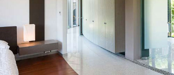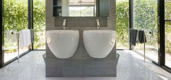 The house’s interior is built around the ‘spine’ of its extensively glazed, gently curving gallery corridor, which emulates the shape of a nearby creek while capturing the sound and energy of the waterfall.