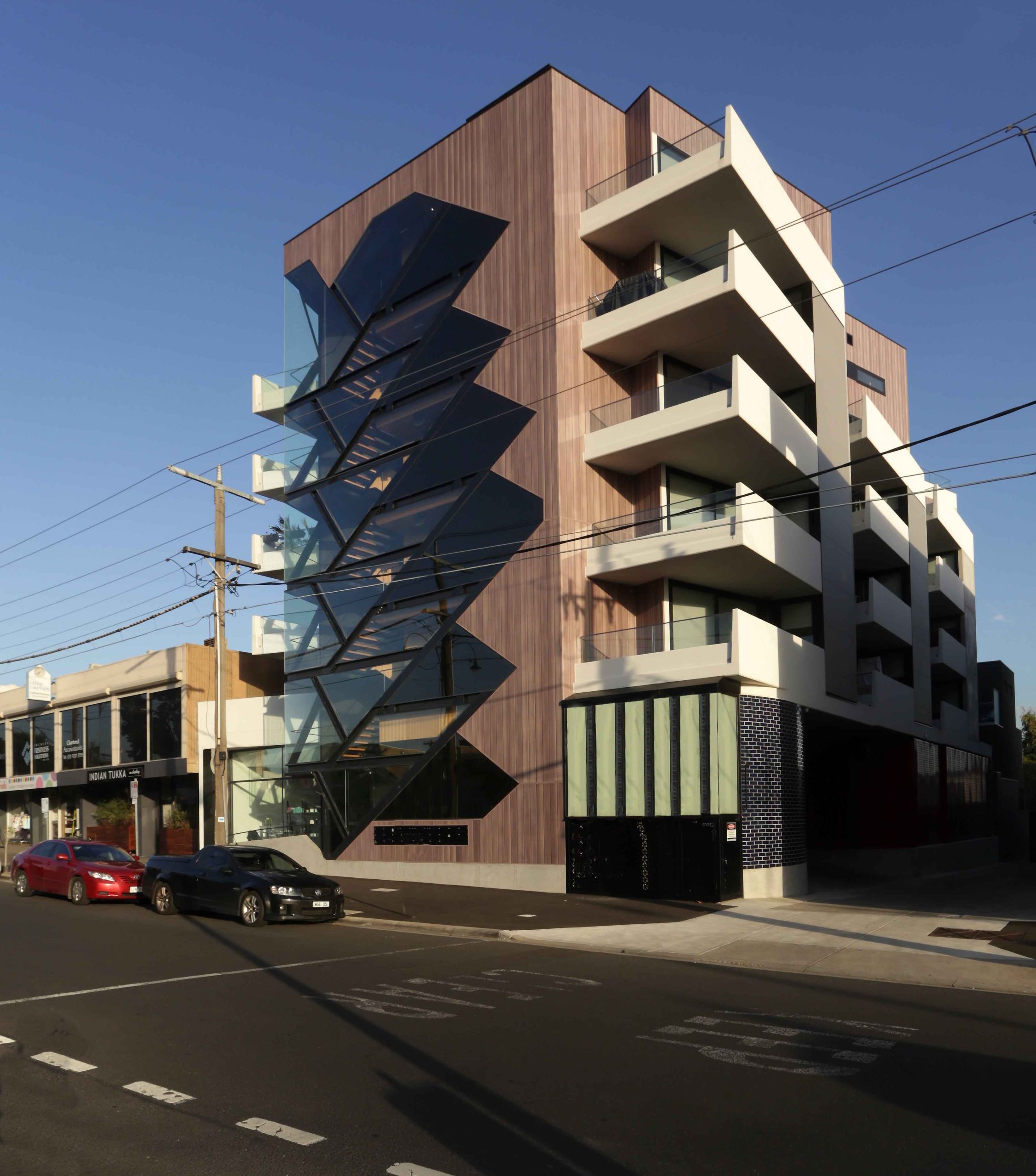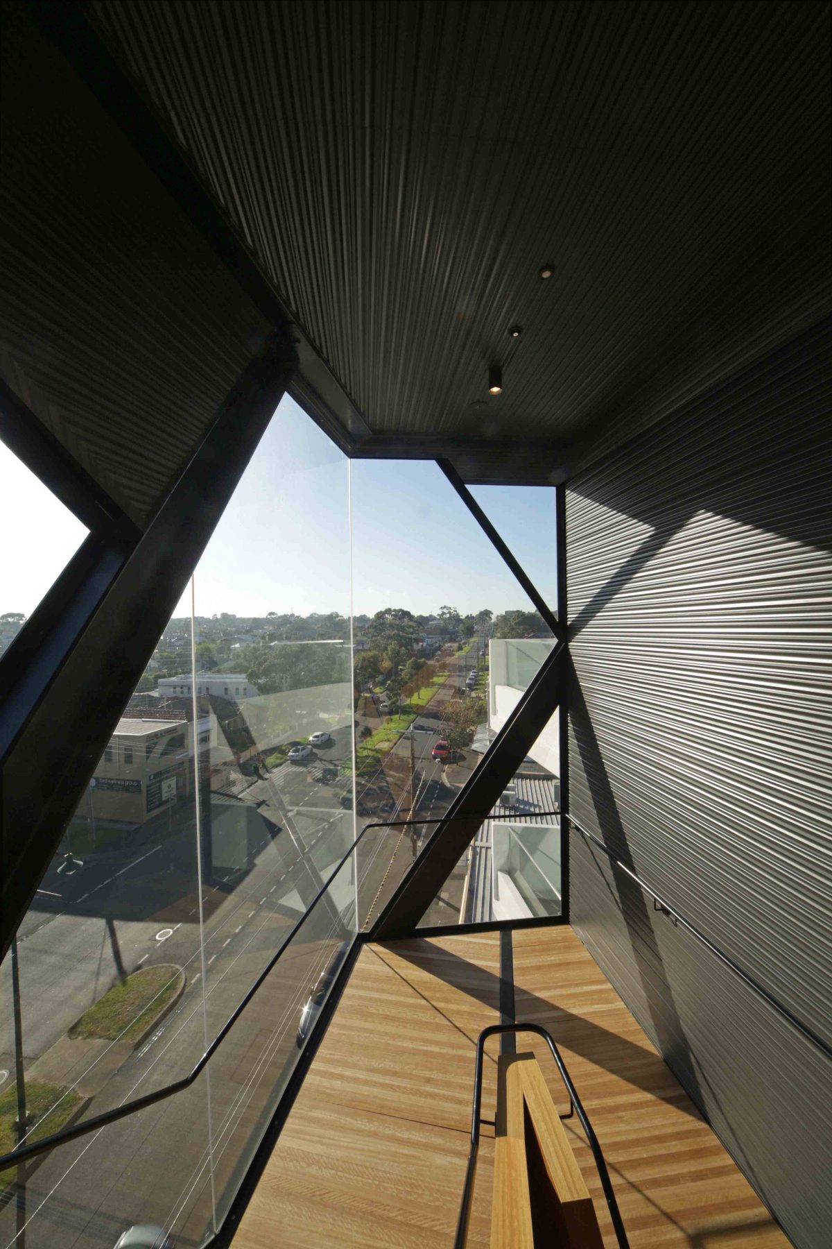 In a subtle but nevertheless overt way it is designed to be noticed. Hopefully this engagement will be positive and promote an understanding that the building introduces a new and progressive element into the streetscape. A building which consolidates existing neighbourhood characteristics revolving around a sense of security and amenity and moderate controlled growth as opposed to stagnation. The building must also express its primary purpose as a residential apartment that exists in balance with commercial and other similar buildings within the wider predominately suburban residential setting. This is achieved by emphasising flanking balconies as the street-wards oriented extension of individual apartments.