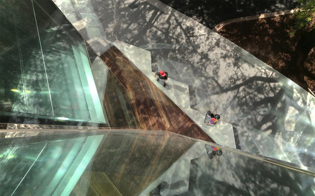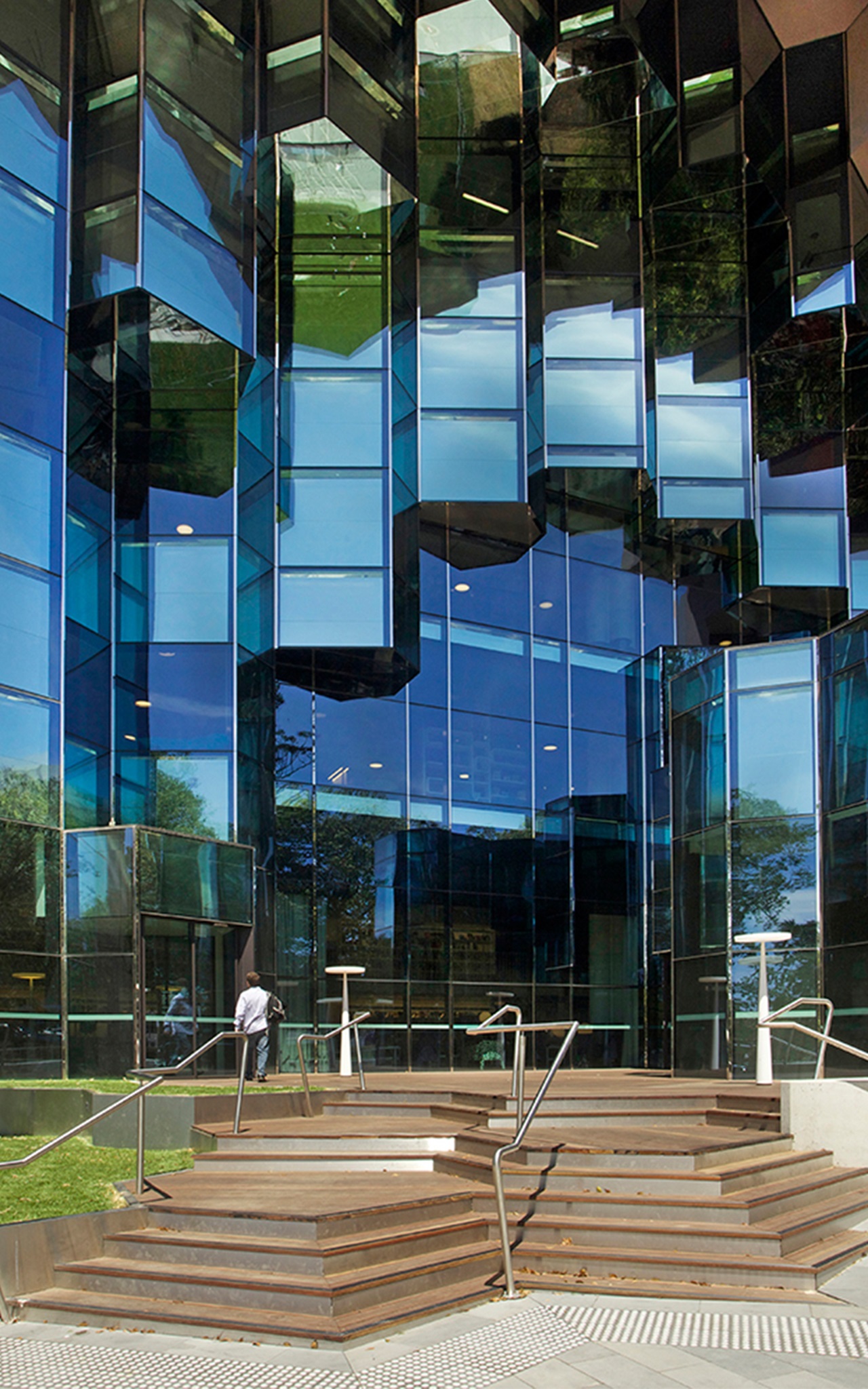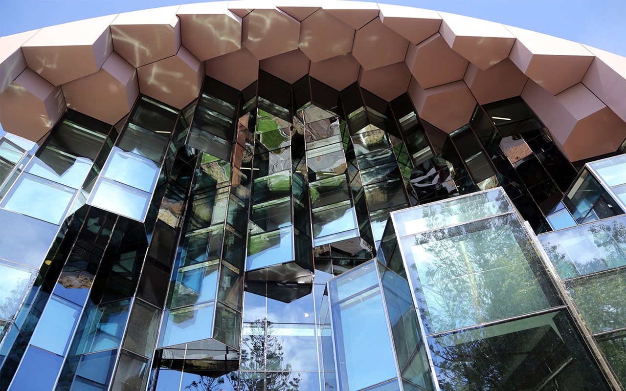 That’s right, the glazing has a very crystalline, jewel-esque quality. That’s highlighted by the polished stainless steel on the leading edge of the glazing. This sits well with the eroded glass, reinforced concrete skin that reveals the magnificent crystalline, stepped arrangement that mimics the entrance to the cave if you like.