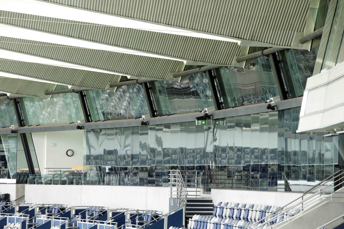 A glass façade such as this is becoming more common in stadiums. You’re right, the technology in glass now allows us to do that. We did a whole series of engineering models to study the ESD and make sure we could get high performing glass that would allow good permeability and excellent viewing. Also from the playing pitch side, we wanted the glass as clear as possible. That ability to use performance glass and the technology that’s been developed for these types of facilities has been fantastic and a great outcome.