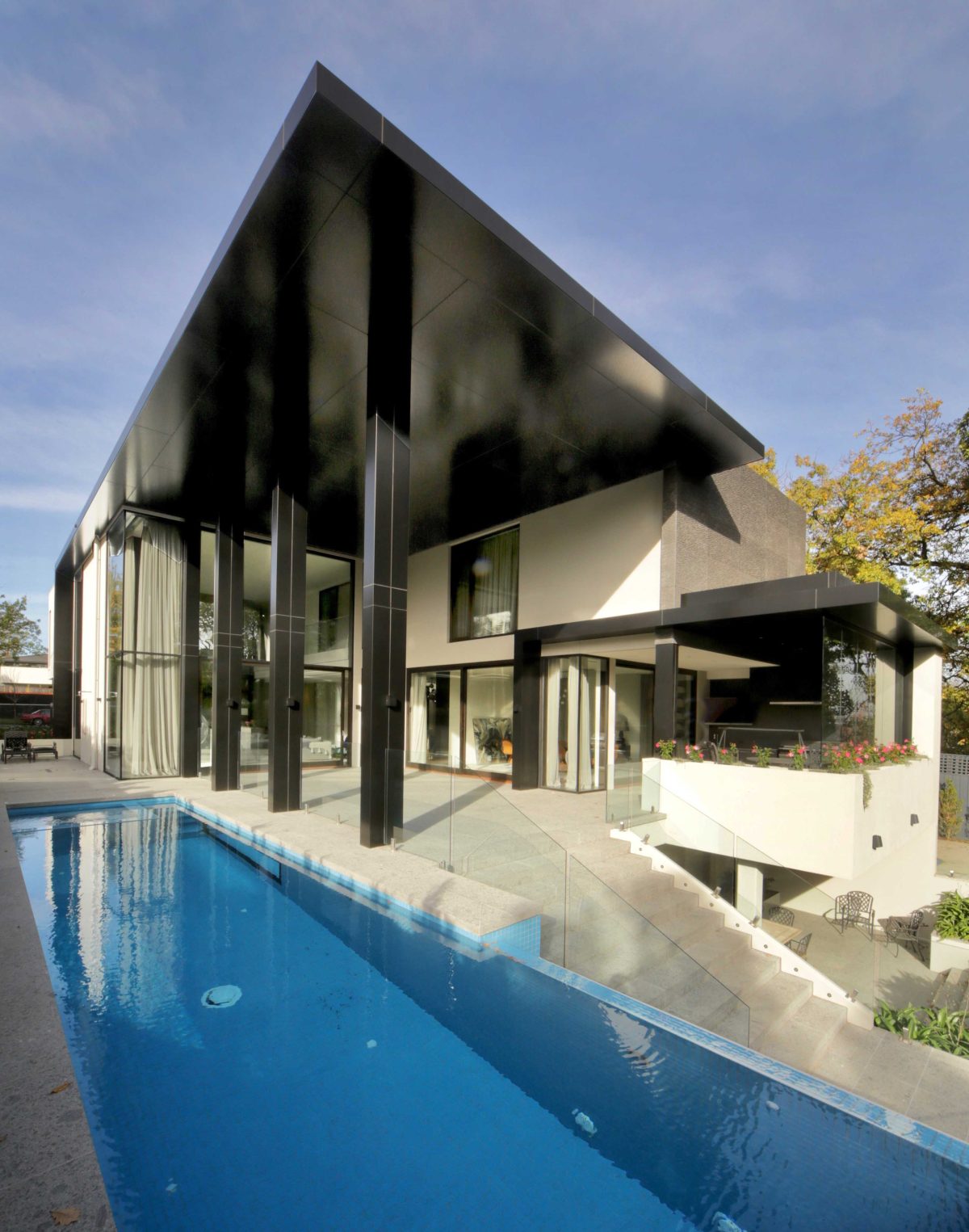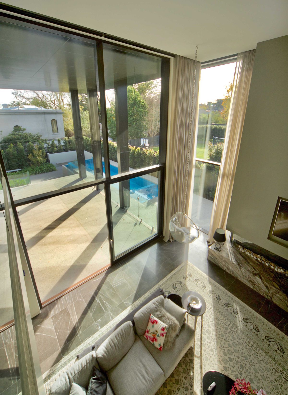 We’ve used Paarhammer and Viridian before. The windows take your eyes vertically. That strong element runs through and takes the eye up. One of the things I’ve been developing, you might notice, is that whole soffit of that very high second storey, Alfresco, if you like to call it, in the front and back, is black. And the interesting thing about black is that black reflects. And when you get up to the second level and look along the horizontality of it, the black turns to pewter. So it’s not overwhelming. It’s sort of counter-intuitive, you might think that this sort of heavy blackness would be oppressive. But it isn’t. It actually gives you a dimension without feeling oppressive. The window frames had to then be the heavy, black, gutsy frames to talk to it.