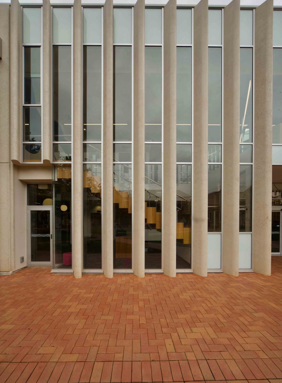 Precast concrete acknowledges the heritage stone buildings facing the main quadrangle. Vertical concrete fins articulate the facades and direct views into and out from the building. The art courtyard to the east opens up views of the original buildings from the street and provides sheltered student work and relaxation areas, while the studio lab on the south-west corner acts as a picture frame for the activities within. Glass is crucial throughout to achieve legibility of form and function. Glass drastically cuts the need for artificial lighting and fills the building along its main east west axis.