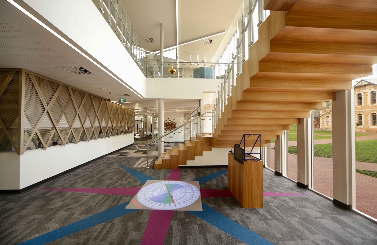 The brief objective to use the building as a teaching tool resulted in deliberate choices of materials, colours, patterns and spatial sequences to embed different concepts within the building fabric. The Fibonacci series appears in carpets, ceilings, lighting, the blue lounge at the top of the stairs, and even in the commissioned artwork. The Mandelbrot set is revealed as sliding door panels stack, while the unique Foucault pendulum in the atrium was designed and built as a research project by the school community.
