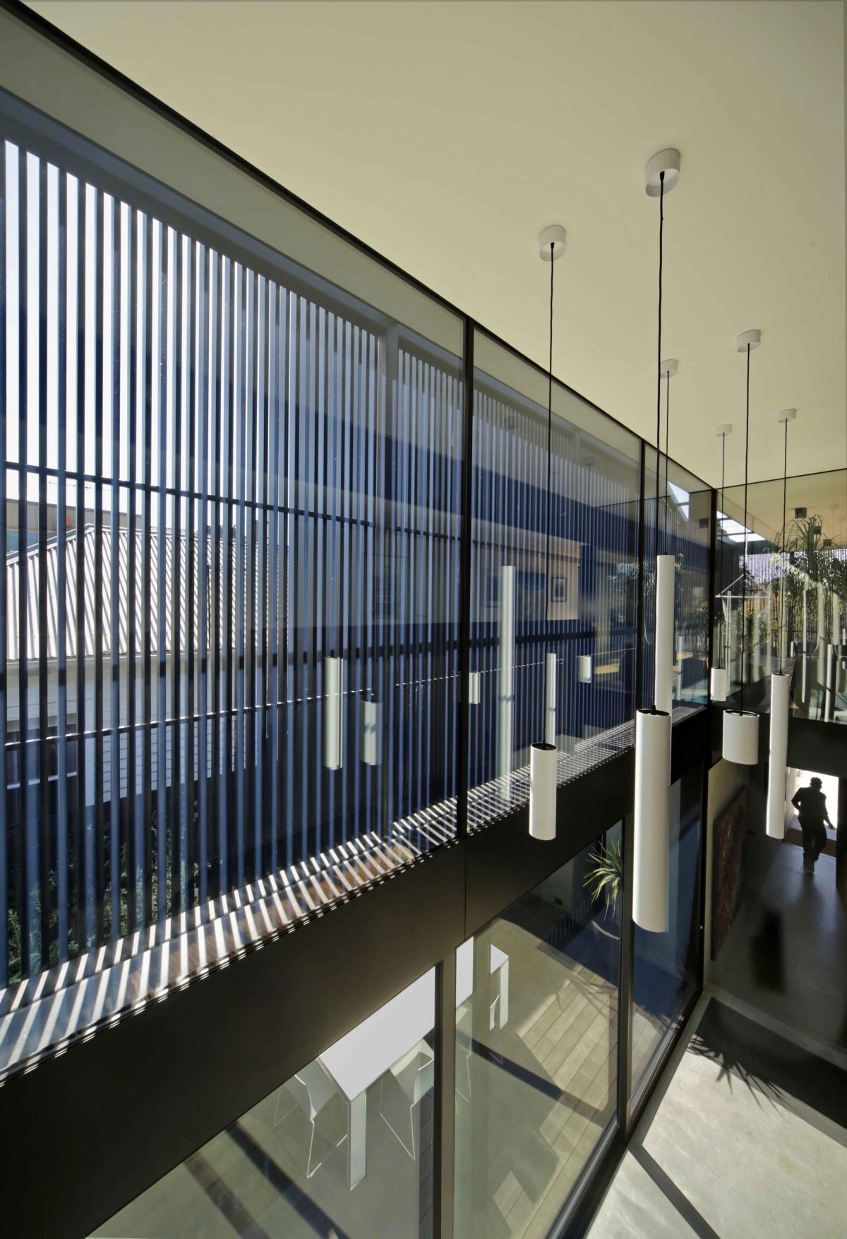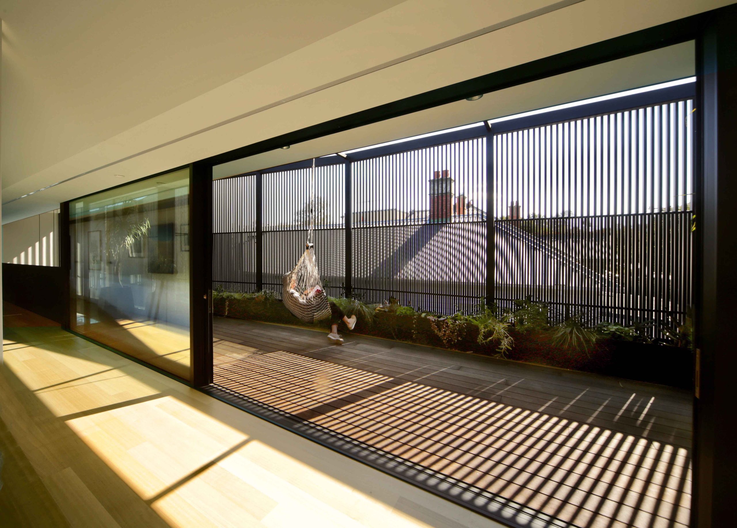 The ground floor space is immersed in landscape. Upstairs a veil of battens provides private outdoor garden