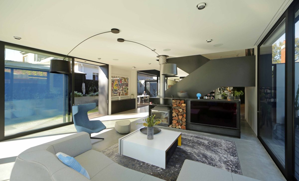 Phil Snowdon: The house sits within a diverse heritage precinct. Informed by our clients’ love of stark materiality and clean aesthetics, it provides a warm and joyful environment. Their new suburban home alludes to the lofty spaces of the converted warehouse they owned previously. Being nestled within a private garden, ‘Ross’ completely satisfies our clients’ brief. The house is a bold sculptural piece elegantly defined. The public facade and entry, the living area within a secluded garden, and the private realm upstairs, provide uniquely evocative environments. Upstairs is wrapped in black vertical aluminium angles and is a study in dealing with domestic privacy within the urban environment.