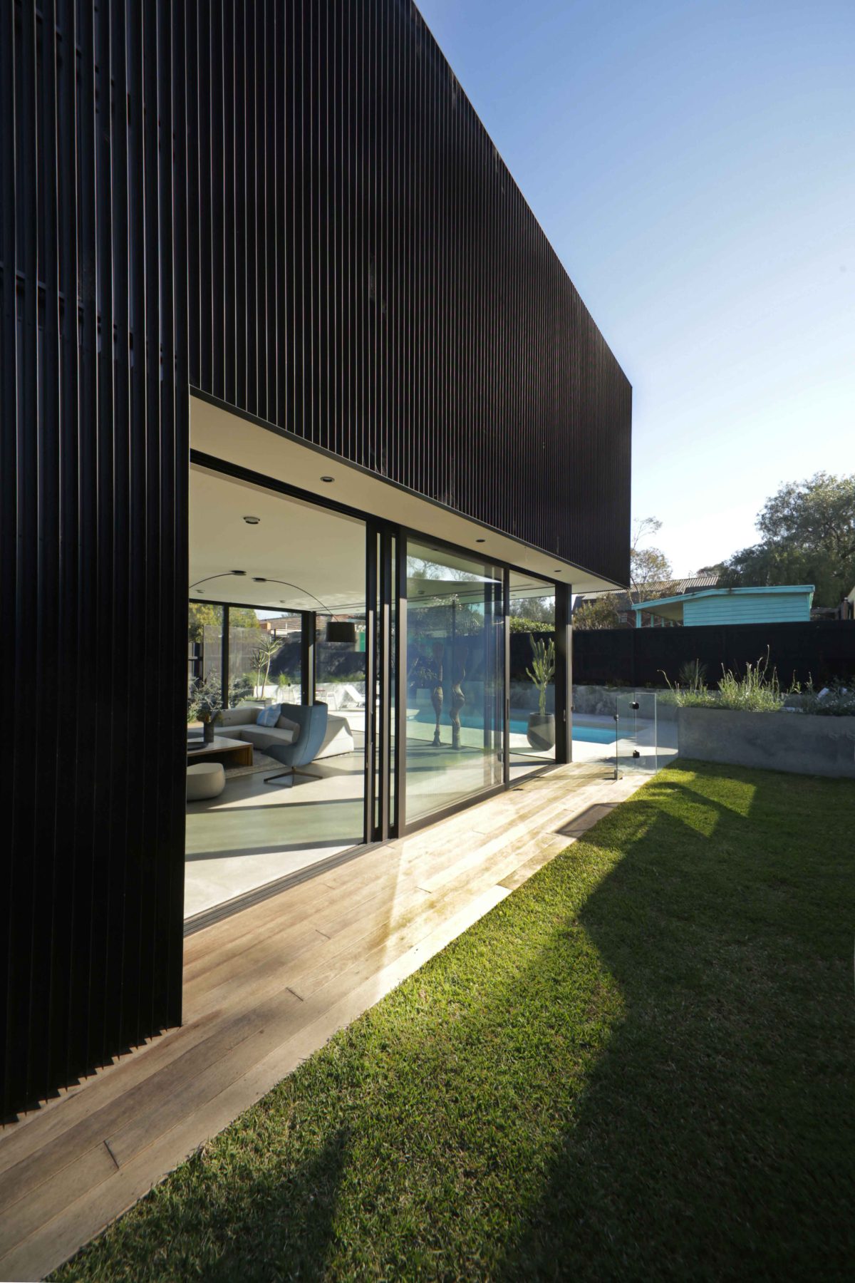away from the southern boundary to ensure sunlight is maintained for the neighbour. The reduced scale sees a house-like silhouette floating in the backyard over the living spaces below. The long northern aspect is carefully designed with passive solar principles and the rear garden is cut into the land creating a deep courtyard and in turn managing the afternoon sun. The house is powered by a photovoltaic installation. There is ample insulation and the house is shaded by the skin of battens, overcoming the thermal issues around a black house.