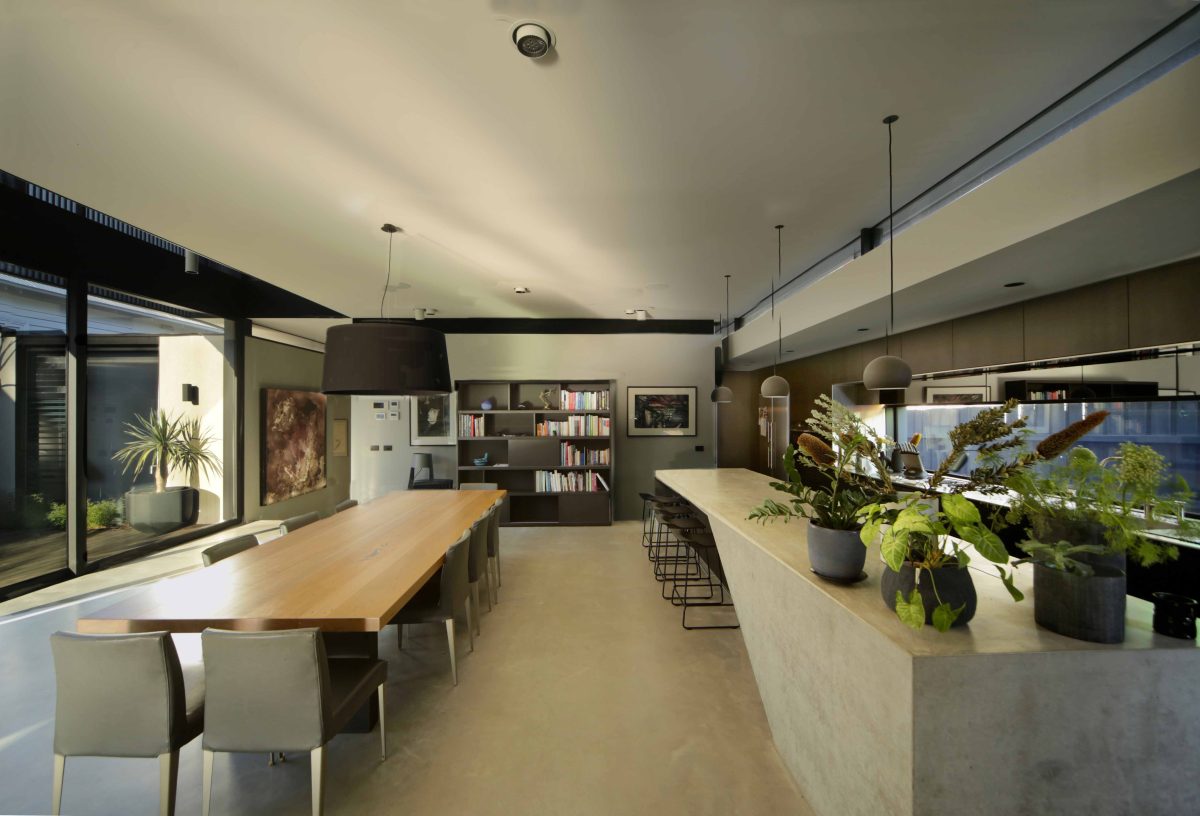 sculptural elements of the steel stair and concrete kitchen bench engage in conversation. The use of mass