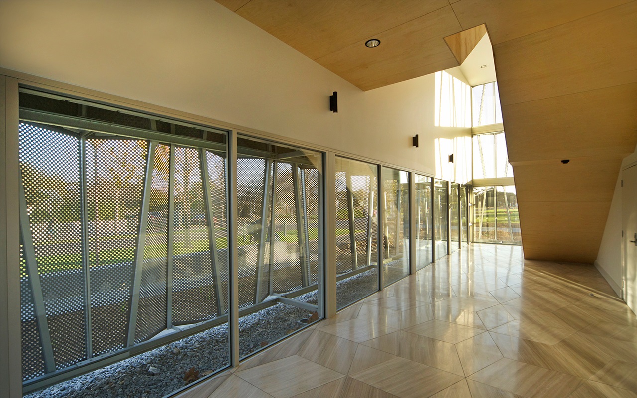 It Is beautiful. We have tried to use it on other occasions and so are very pleased to finally do so. This installation is perfect. It’s an interlocking, double-plank system with excellent thermal performance with a very soft, diffused light. The idea is a low-level viewing window with a continuous seat inside and out. People typically gravitate to the edges and here they are really beautiful. The foyer links to the landscape which is a sea of green. The LED back-lighting to the ProfilitTM makes the floor and ceiling appear to hover.