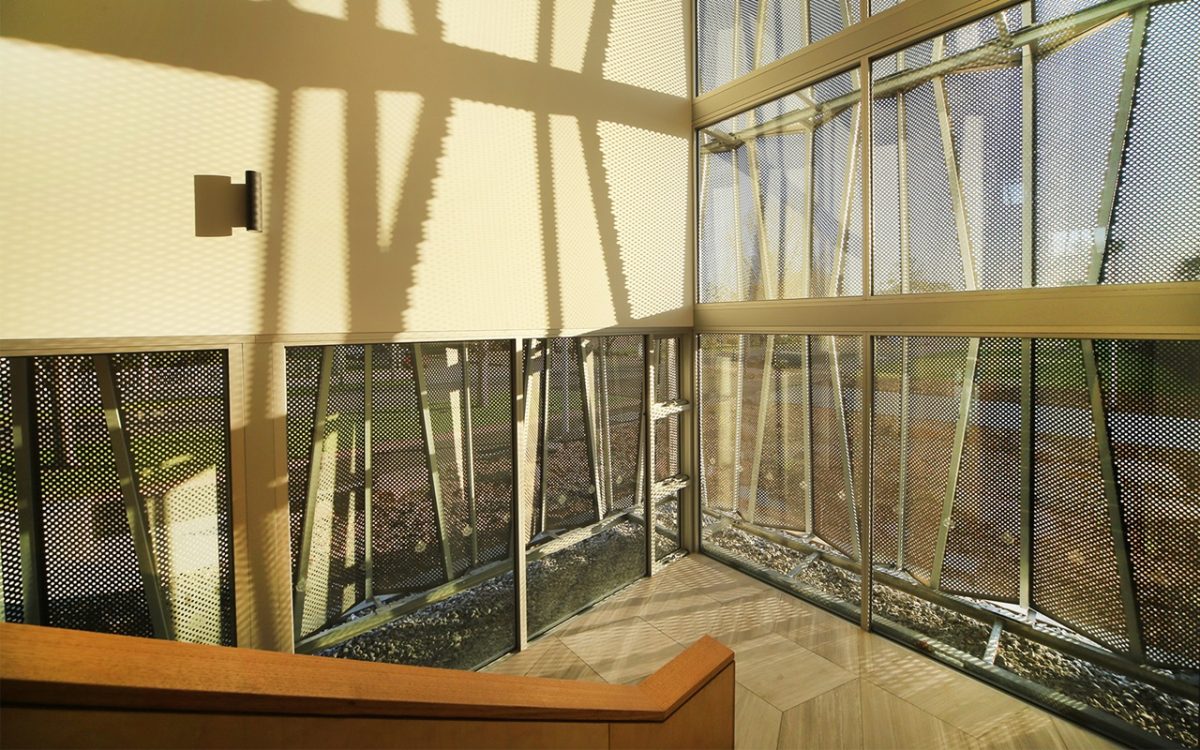 Peter Elliott’s uplifting vision extends throughout. Its folded metal skin and array of glazing contribute to a dynamic form and ever-changing skin, depending upon the time and subtlest inflections of light. Interior planning and finishes maintain the groove.