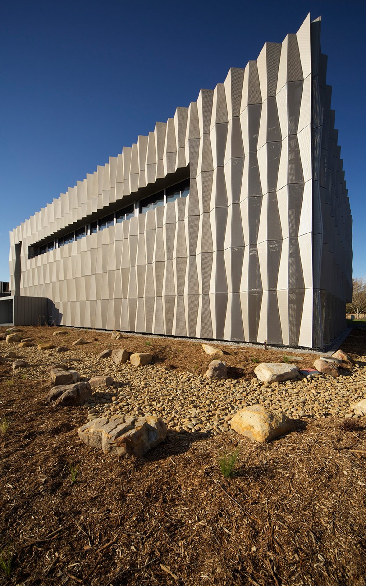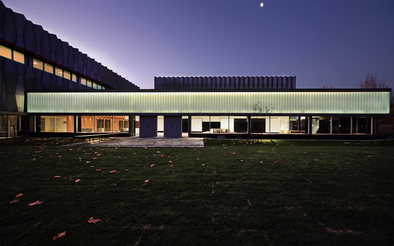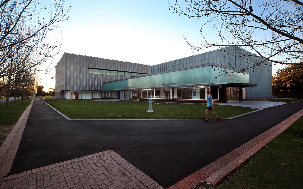 the school’s village landscape, Corio Bay is a painterly blue strip at the end of the tree-lined avenue. The project appears the work of an origami master with a crisply folded skin and rhythmic glazing for a convincing, if not theatrical, resonance.