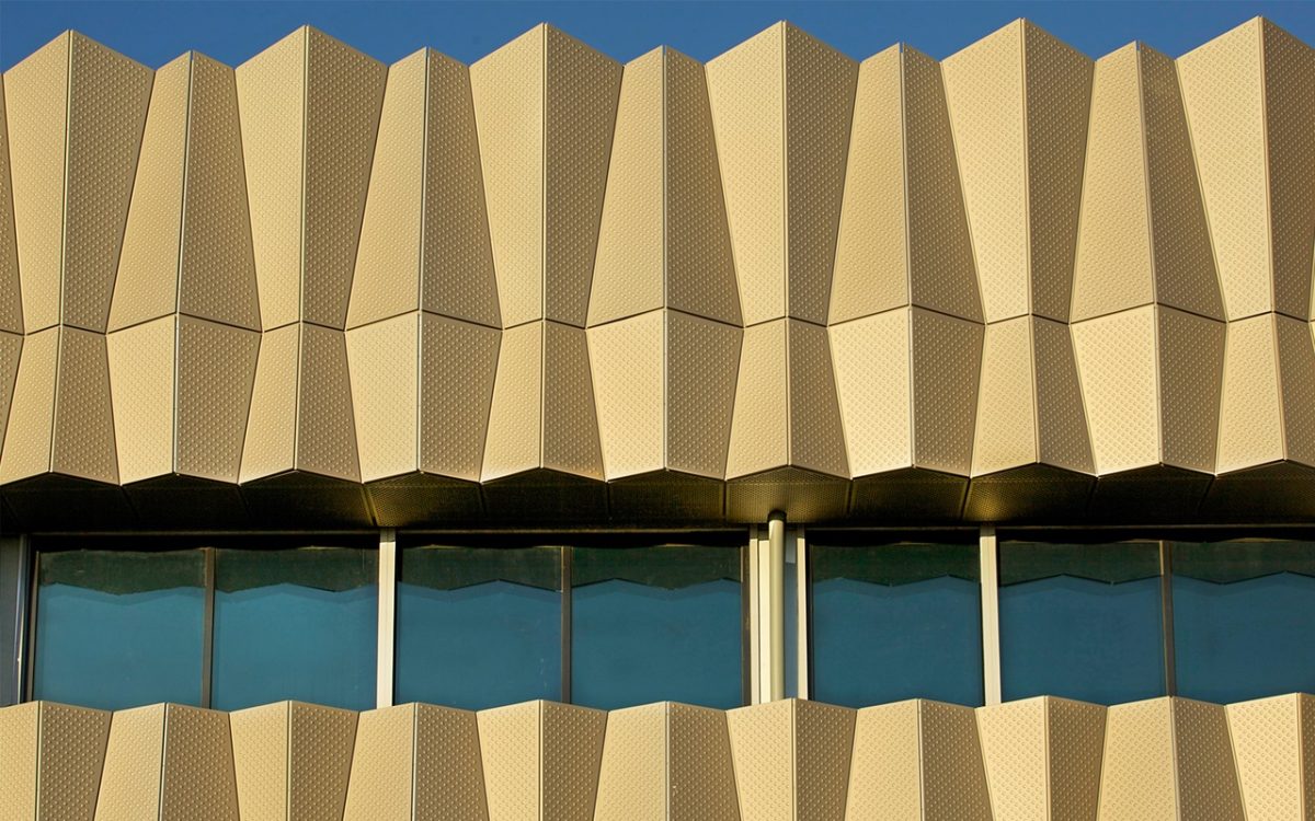 The founding idea is this open, welcoming glazed corner. Its glass prism shape adjoins two very strong tectonic boxes clad in a gleaming skin. The skins are anodized aluminium with embossing and a number of perforations for a shimmering surface effect. It’s amazing how strong that is in all forms of light.