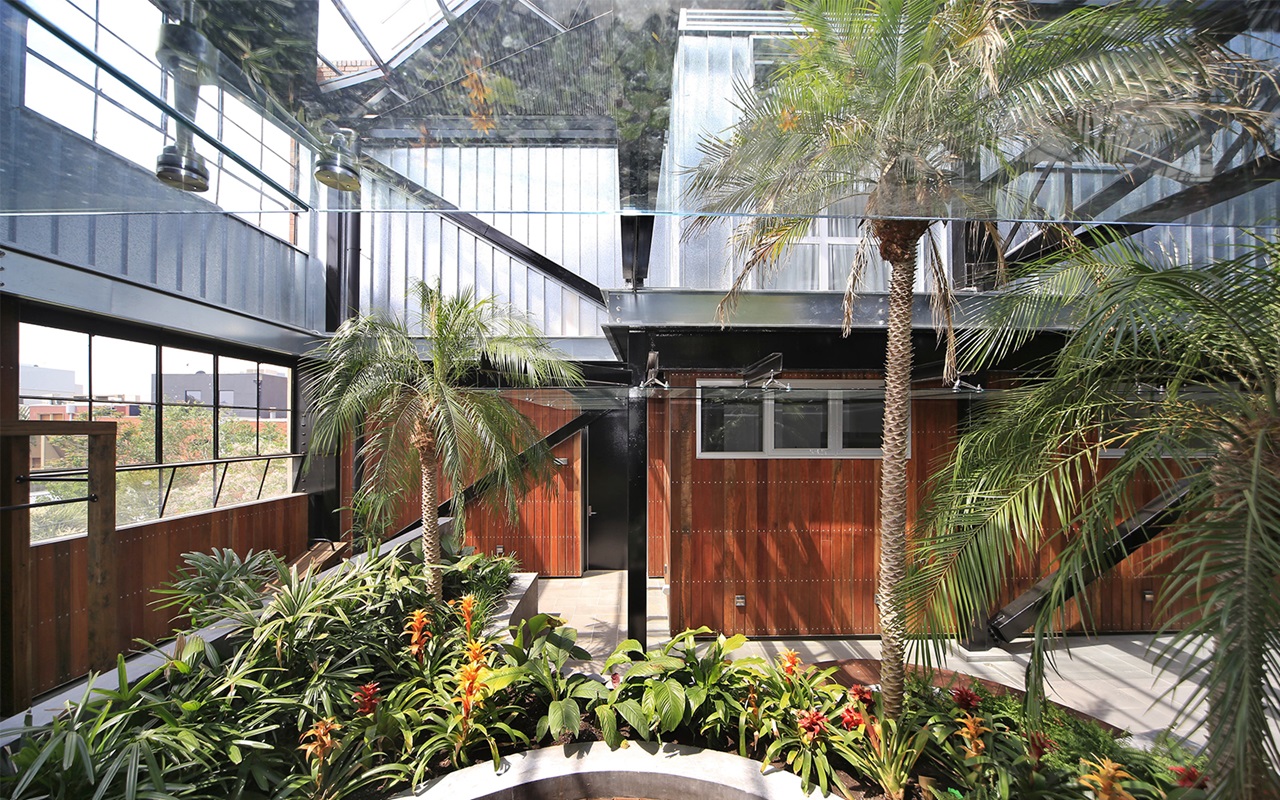 Melbourne’s inner-urban Prahran is the backdrop for the latest series, headlined ‘The Glasshouse’. Viridian glass proved invaluable in taking a 1980s office block to celebrate its 19th century origins in 21st century style. The Block’s creators, Julian Cress and David Barbour, and program architect since inception, Julian Brenchley, recognised the building’s lost promise. Brenchley’s masterstroke saw the return of the industrial vernacular including a saw-tooth iron roof converted from iron sheeting to glass. The result is a lofty, central atrium formed by glass walls north and south that lightly enclose a light-filled botanical Centrepiece.