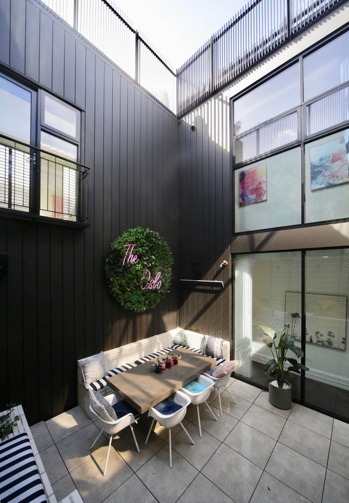 The use of glazing throughout the center way of the courtyard all the way up provides all levels of the home access to natural light as well as connection with the outdoor spaces.