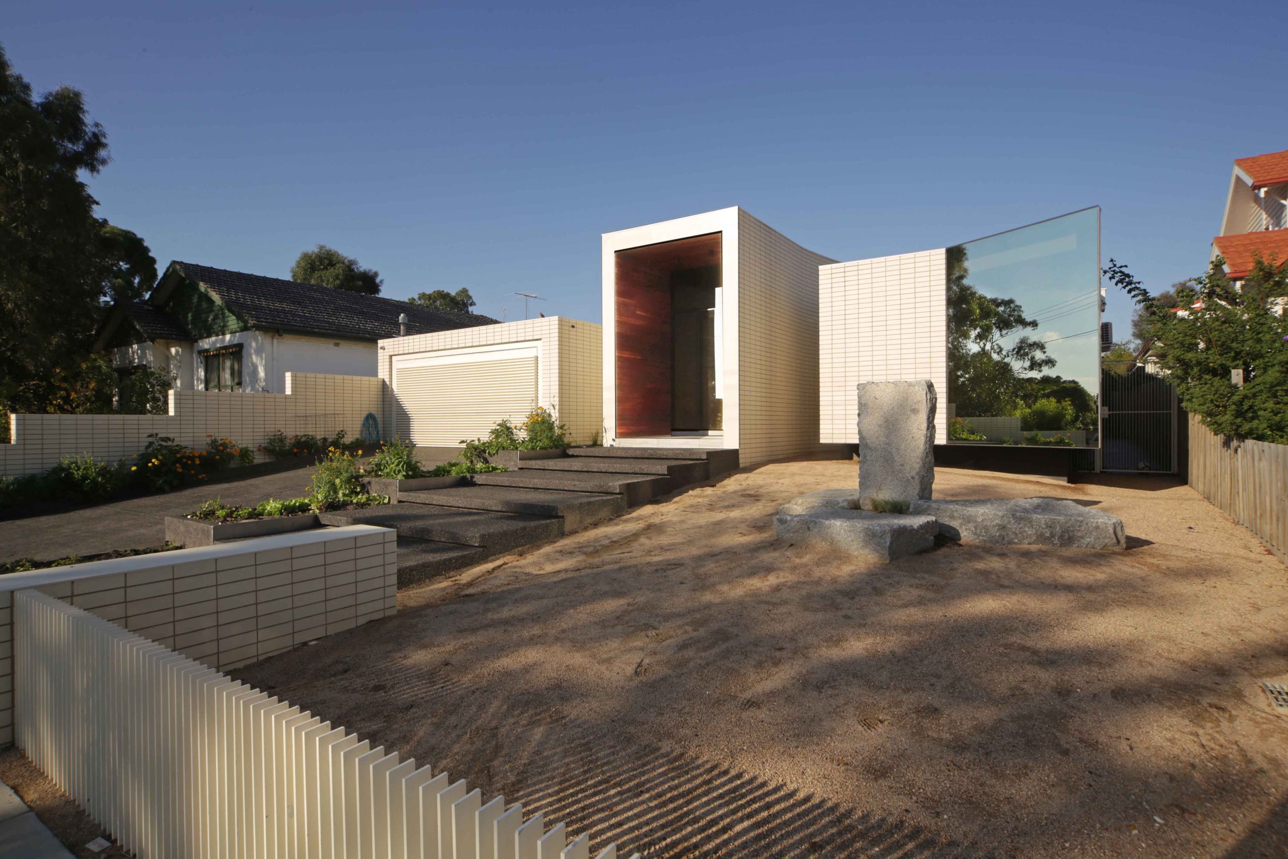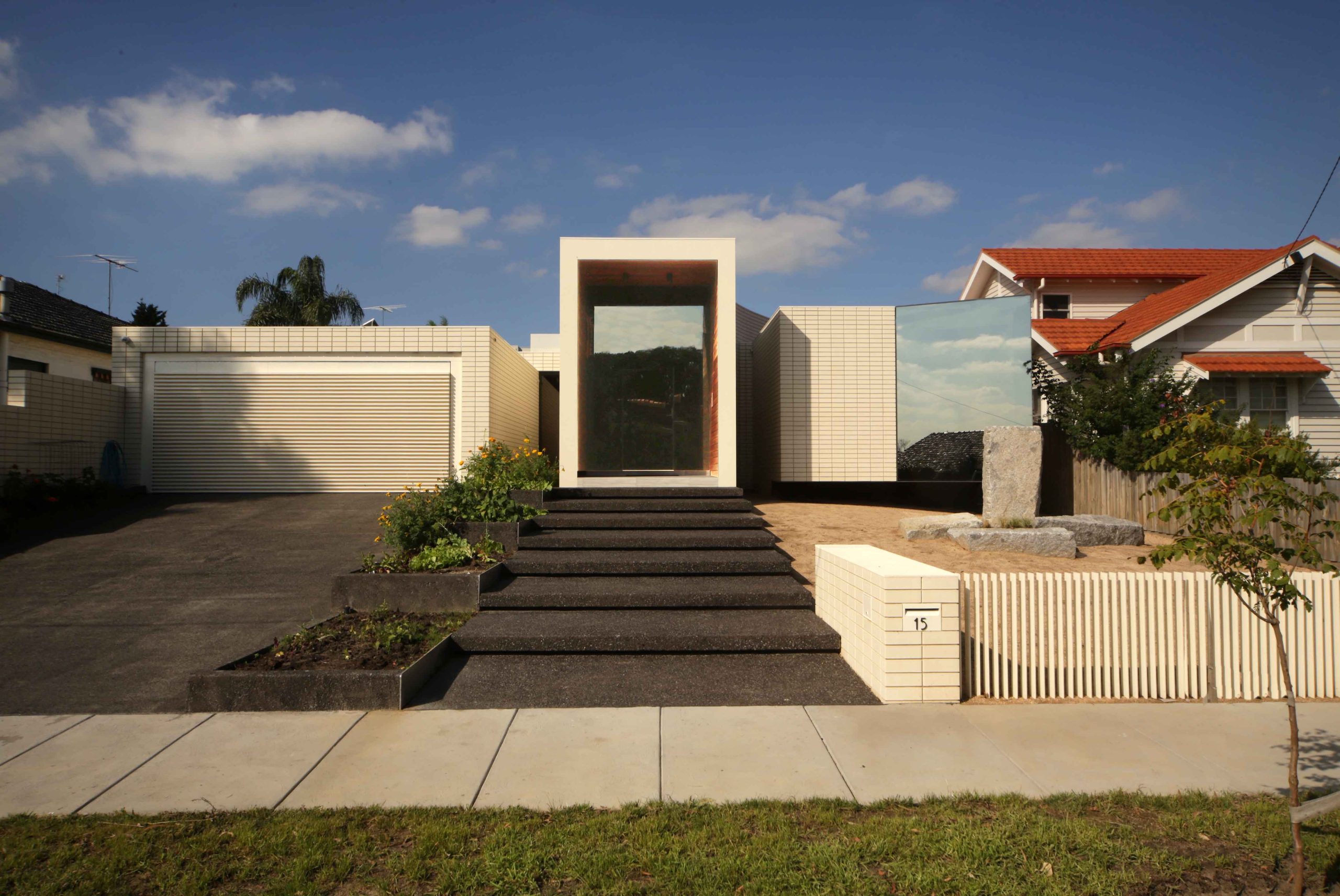 Billy Kavellaris: It can be read as a conversation of mass and lightness, public and private, light and darkness. From the street the house presents in two parts with a central black void as grand entry. On the northern, or left side is a solid, rigid, rectilinear form, seemingly weighed down by its own mass. On the other, elevated from the earth is a shard of glass symbolic of light.