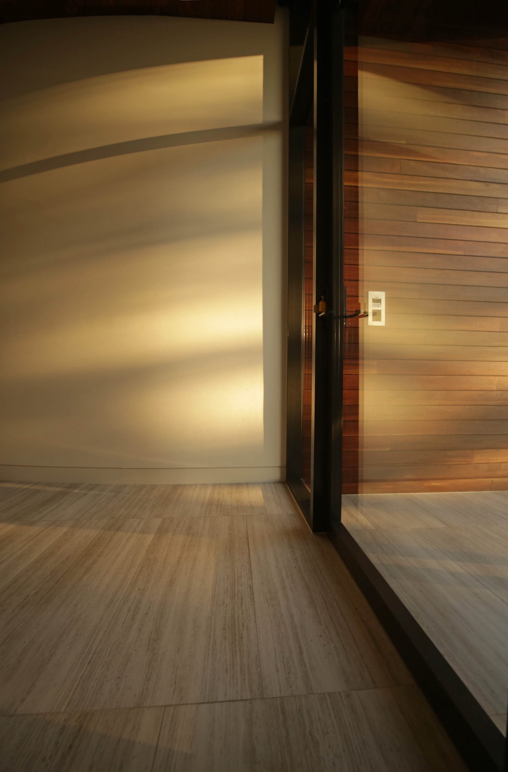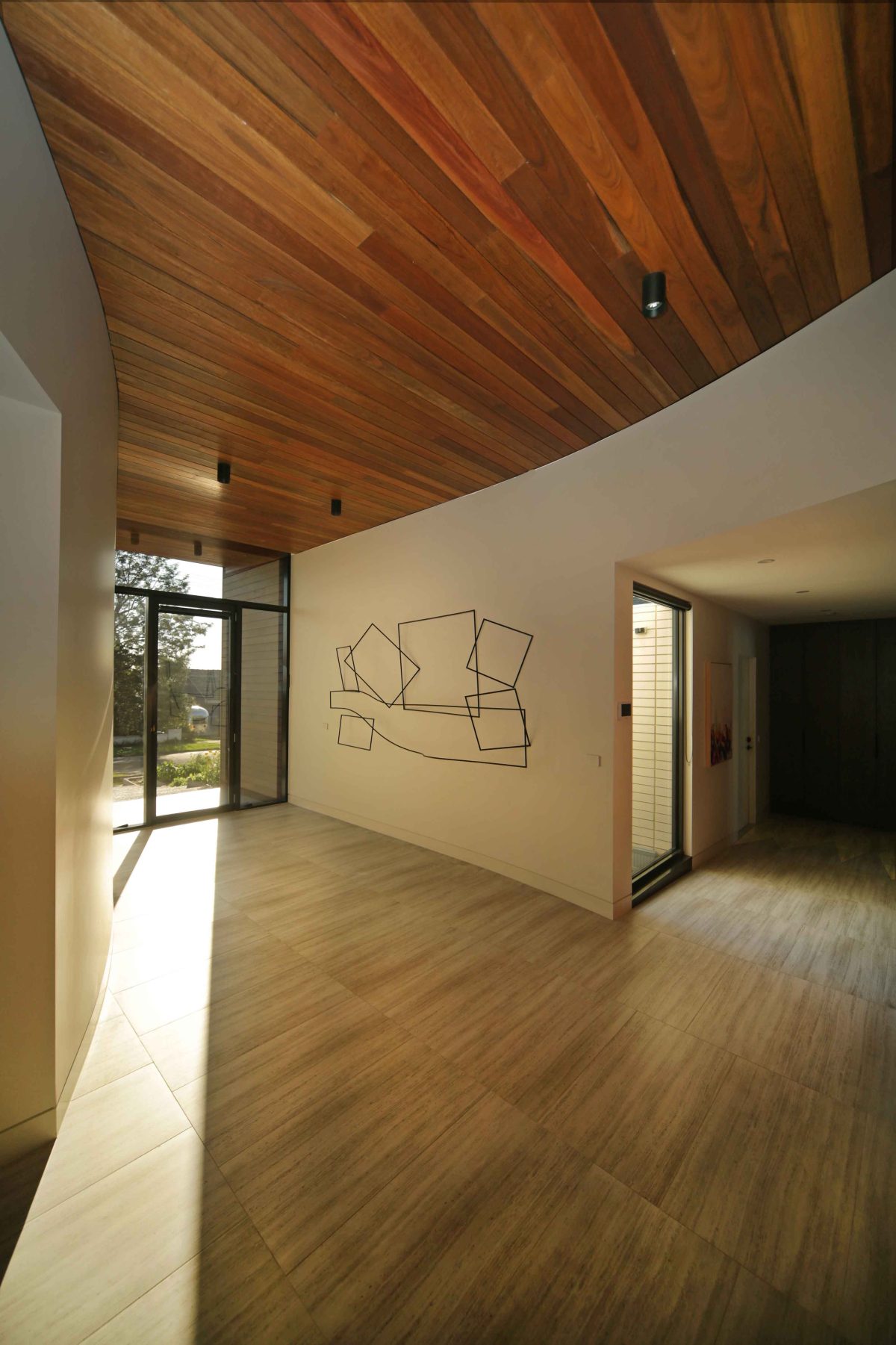 home has a sculpture we designed on the wall, which is an abstraction of the floor plan that sits on the wall and, because of the westerly light, when that light hits that sculpture the shadows change and they dance around on that wall. The wall is nice and curved, but the main reason why I like that space the most is because when you enter that space, you pretty much can see the mystery of the home unfolding right before you spatially in an instant.