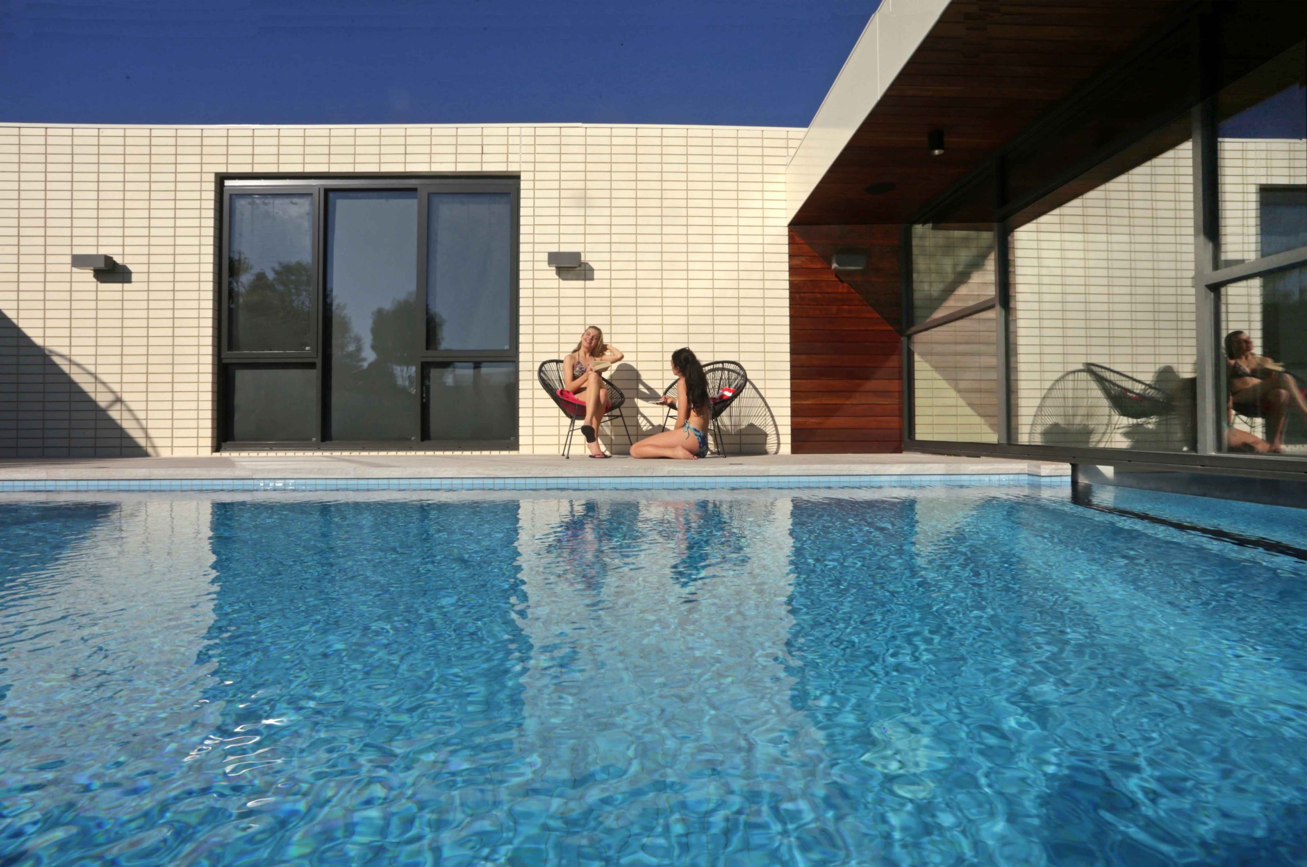 The feature ‘reflection’ window of the street-facing living room overlooks a granite garden sculpture, trees and sky. The bonus is an interior of complete day-time privacy and virtuoso example of Viridian’s reflective coated glass which highlights its setting. Behind its façade, the house reveals openness and delight with swimming pool as immersive to the eye as body