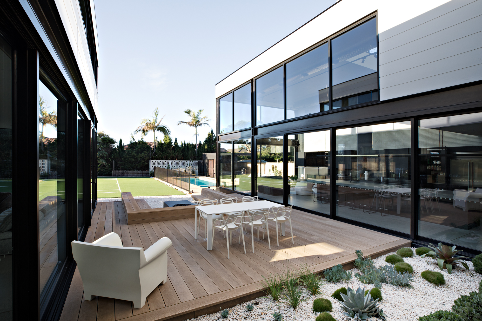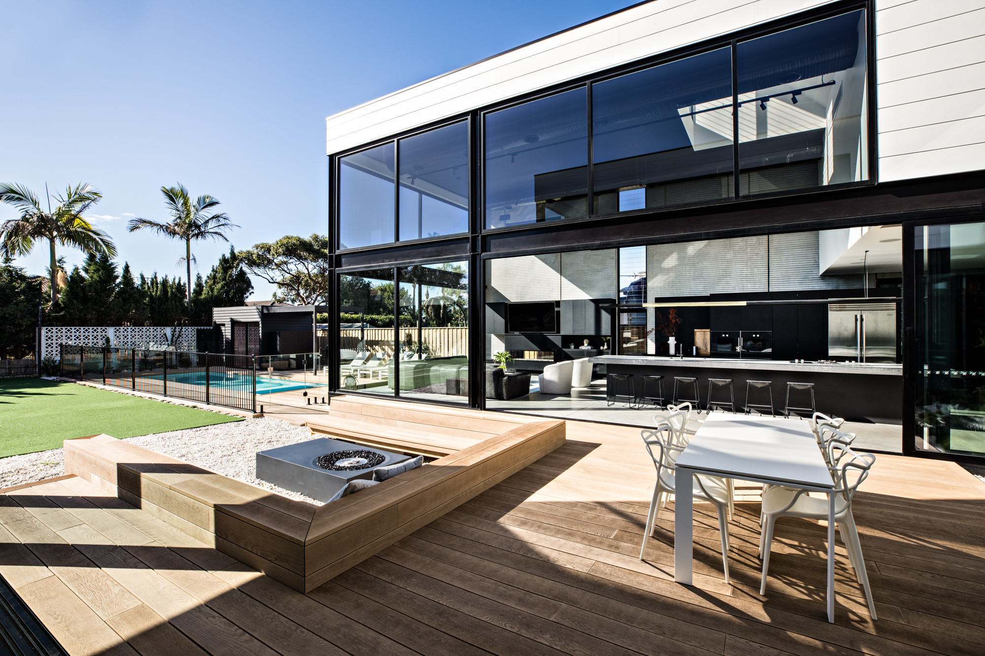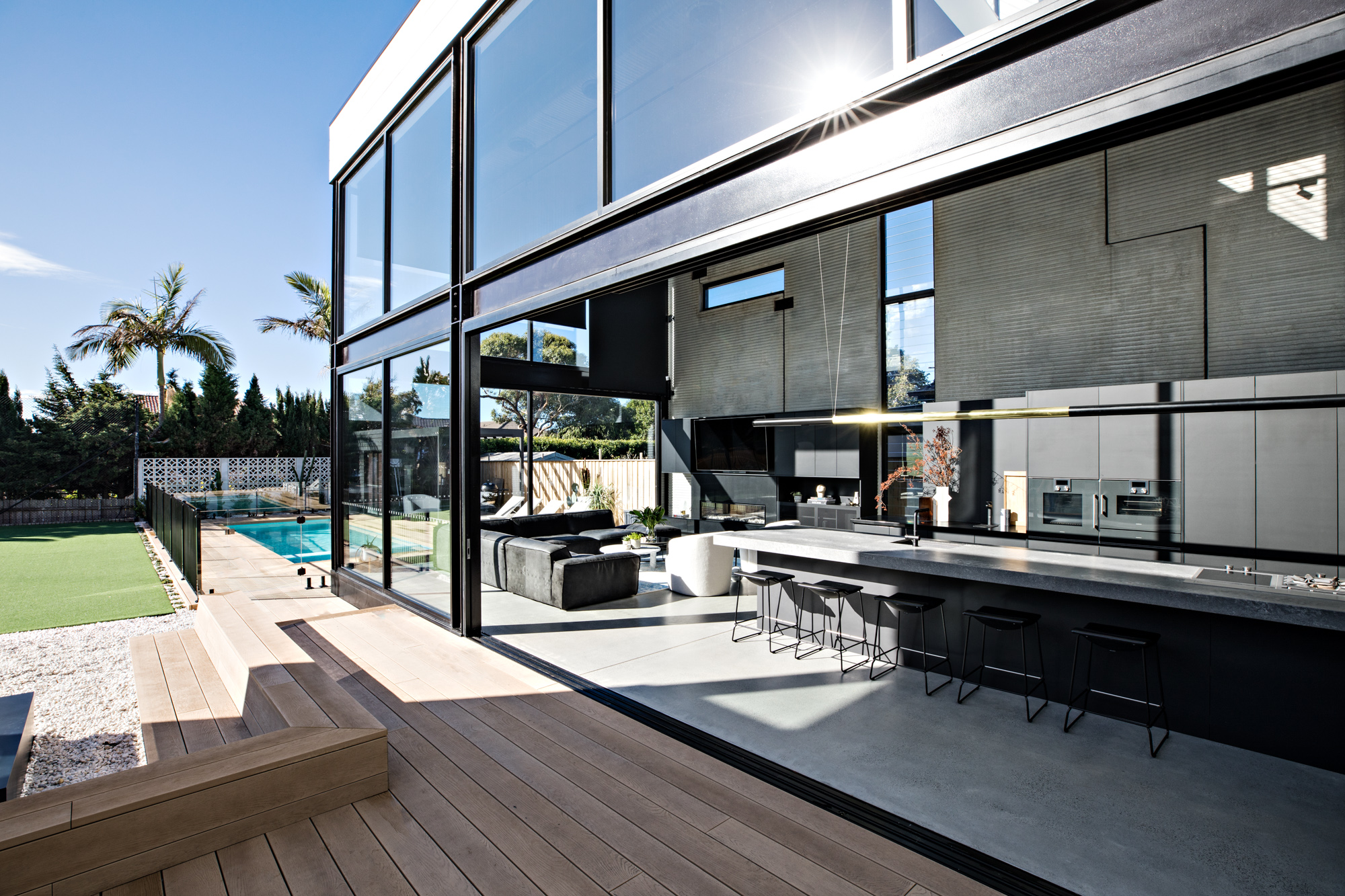 Expansive windows line the internal perimeter of the home, this creates an abundance of light as well as a sense of connection between the indoor and outdoor. This space is ideal for entertaining, taking some time out at the pool or watching the kids playing in the backyard.