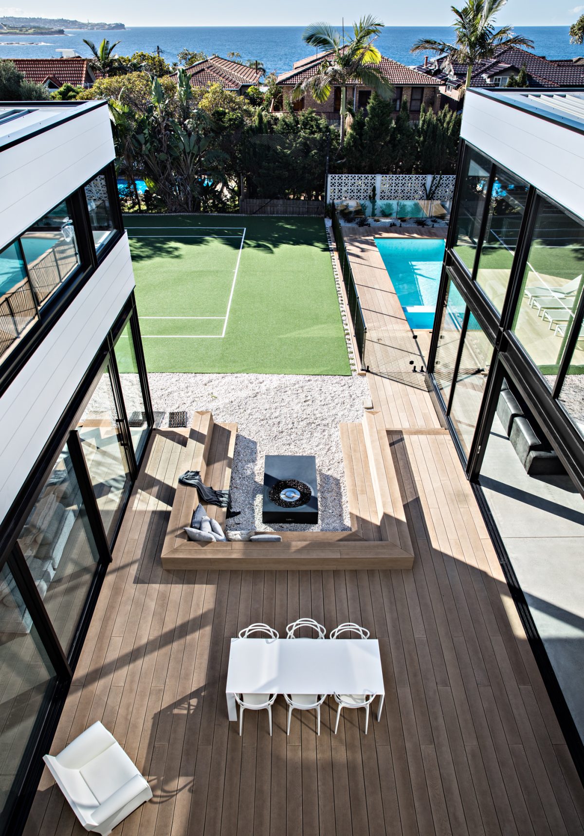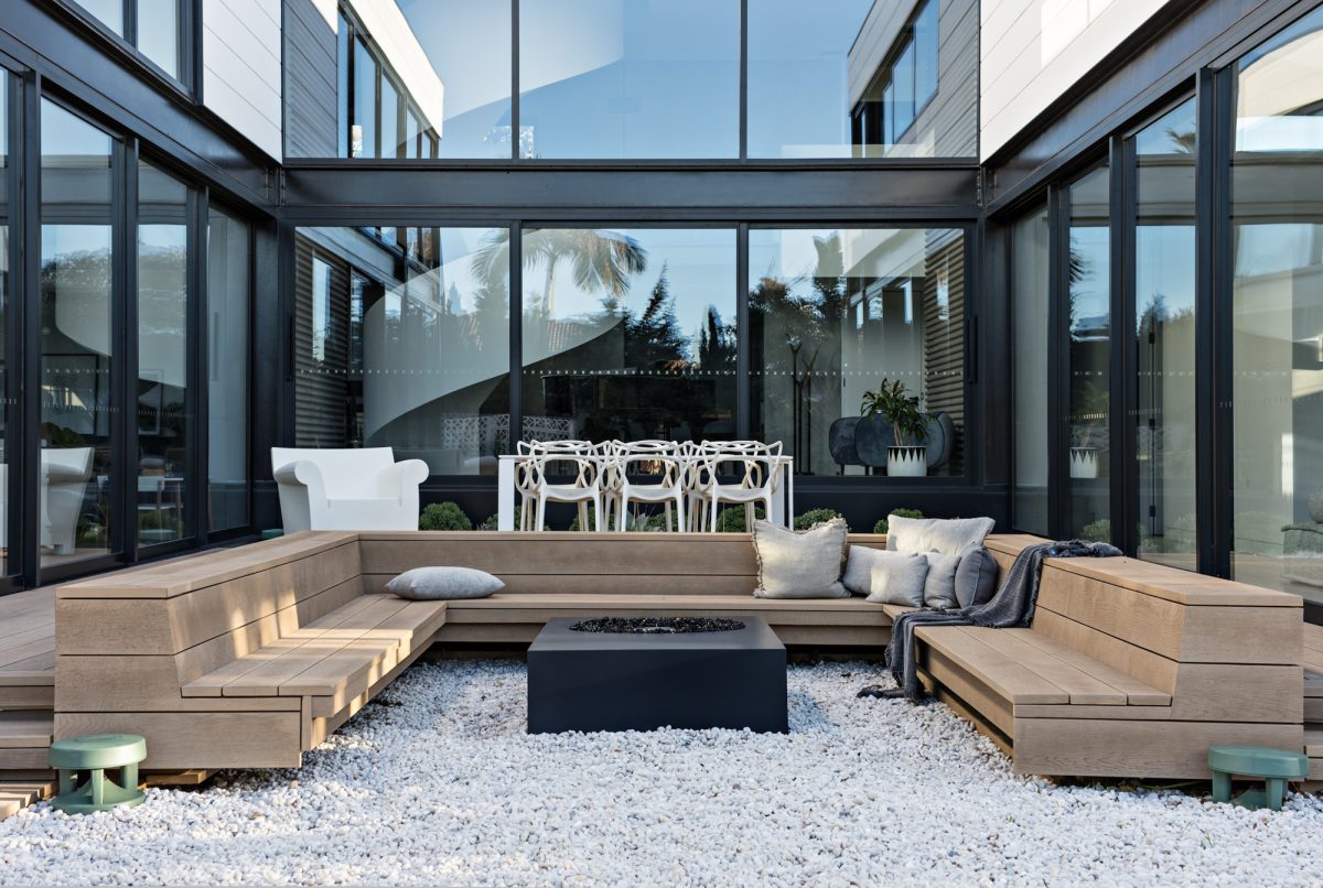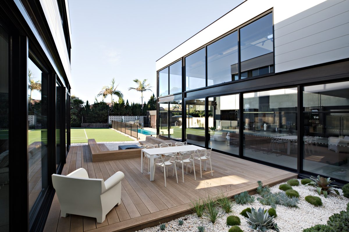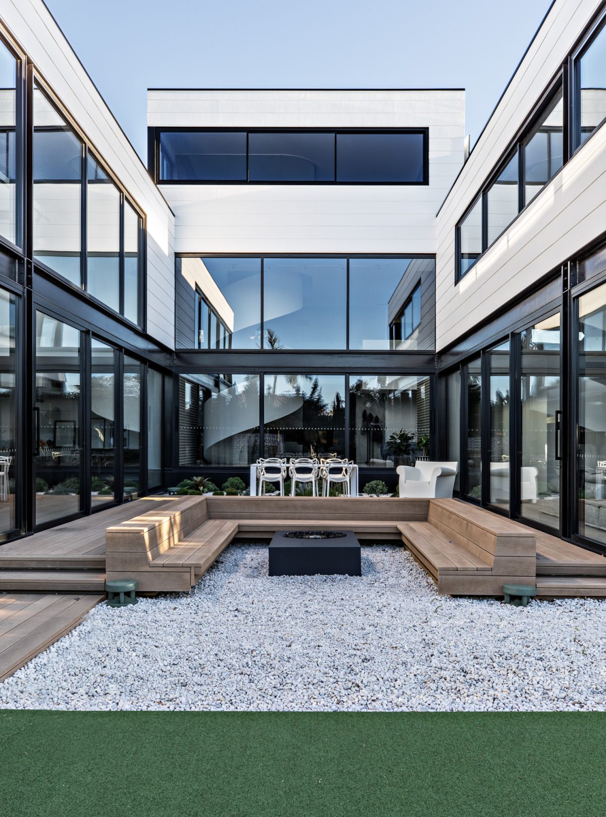 Privacy is also important, and the glass lining the internal perimeter of the home allows for privacy without the family feeling as though they are blocked in and away from the outside.