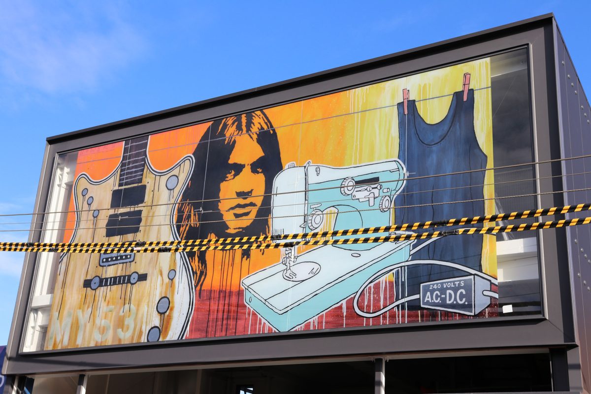 The image is a tribute to Malcolm Young, one of the founders of Australian rock band AC/DC. The electric guitar and singlet are tributes to Young, and the sewing machine is significant because the name of the band was reported to be inspired by the reference to AC/DC on the power cord of the sewing machine owned by Malcolm’s sister, Margaret (Margaret also used the machine to make some of the bands’ costumes!).